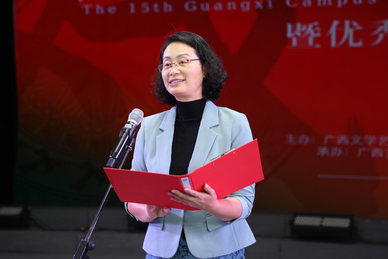 黄平在致辞中指出,广西校园戏剧节不仅是一个展示青春才华、演绎人生百态的舞台,更是一个传承文化精髓、培育艺术新苗的摇篮。戏剧节的优秀作品不仅让观众感受到戏剧艺术的魅力,更在朝气蓬勃的戏剧作品中体现“中华民族共同体”意识,看到“文化自信”,体会到青年人“文化自强”的决心。期待广西校园戏剧节能够继续发扬光大,成为广西校园文化的一张亮丽名片,期待更多的师生用才华和热情,为广西校园戏剧事业注入新的活力和动力。