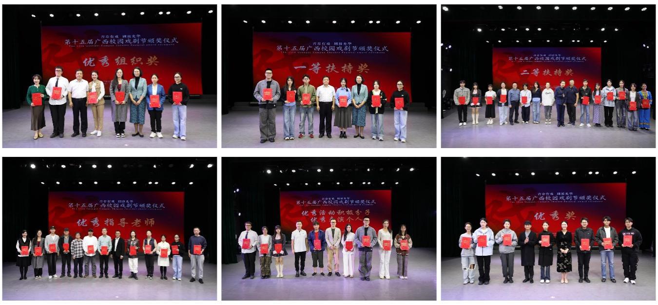 活动现场,广西文学艺术界联合会、广西艺术学院领导分别为获奖集体和个人颁发证书。本届广西校园戏剧节以“青春有戏 剧放光华”为主题,鼓励广大青年戏剧爱好者积极投身于戏剧文化的创新和发展,展现新时代青年的精神风貌和艺术才华。活动自今年5月启动以来,第十五届广西校园戏剧节共收到全区15所高校参评作品达210件,包括原创剧目、原创剧本及戏剧评论作品,戏剧种类丰富,艺术风格多样。经专家评审,共有8个剧目、14部剧本、6篇作品戏剧评论获得一等、二等扶持,另有13个剧目、11部剧本、10篇戏剧评论作品被评为优秀作品。此外,还特别评出“优秀组织奖”“优秀表演个人扶持”“优秀指导老师”“广西校园戏剧活动积极分子”等荣誉称号。
