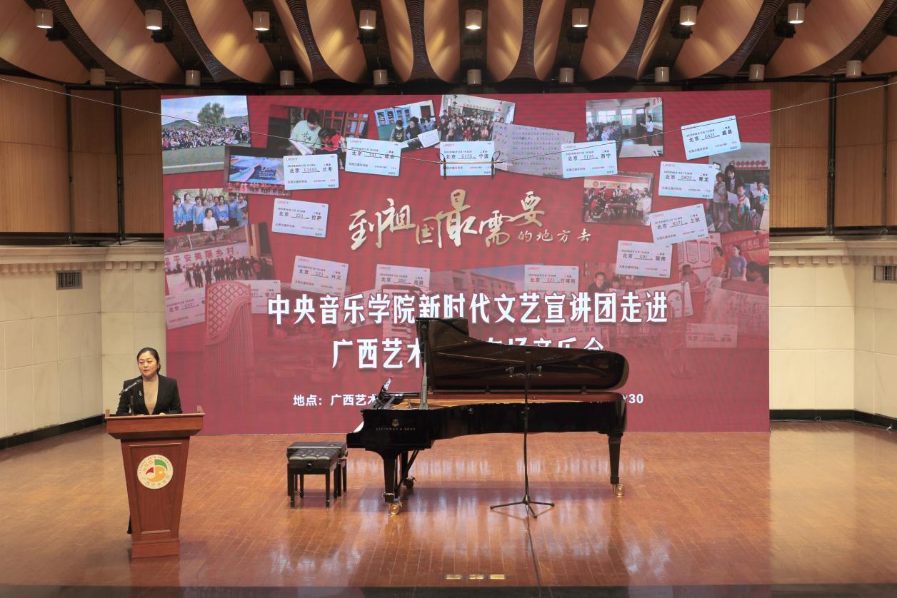 音乐会在我校音乐学院民族艺术系同学们欢快的广西民歌联唱中拉开序幕,中央音乐学院文艺宣讲团团长、学院办公室主任兼党委宣传部常务副部长王歆老师从“青春的意义”切入,将中央音乐学院文艺宣讲师们在祖国和人民最需要的地方绽放文艺青春的感人故事娓娓道来,阐述了中央音乐学院启动“新时代文艺宣讲师”项目的大爱情怀。