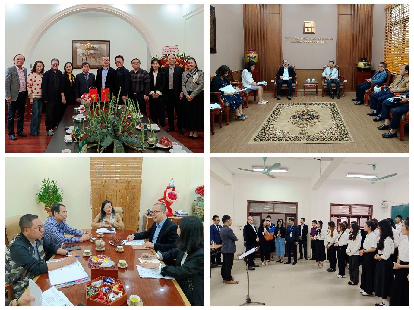 11月25日至27日,谢仁敏率团分别访问了越南文学艺术界联合会、越南工业美术大学、越南舞蹈学院、越南中央艺术师范大学等友好单位。在越南文学艺术界联合会,杜洪军主席会见了访问团一行。双方共同回忆越南著名音乐家、越南著名对华友好人士杜润于1966年创作歌曲《越南—中国》的过程,高度认可他对于推进中越人民友谊的巨大作用。双方还规划了新合作的领域和要点,尤其在音乐联合创作项目方面将开展深入合作。在越南工业美术大学、越南舞蹈学院、越南中央艺术师范大学,我校代表与受访高校就师生跨境交流、学术合作开展、创作项目合作、合作平台建设、艺术教育资源开发等话题展开深入讨论,达成一系列合作共识。