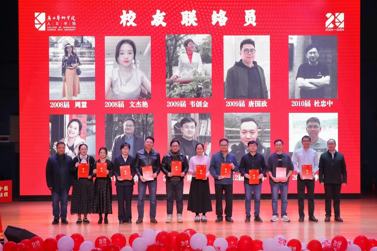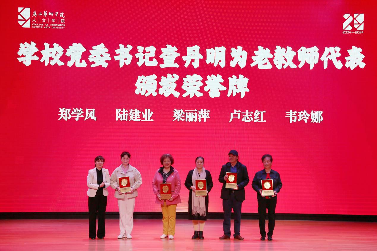 查丹明为退休老教师郑学凤、陆建业、梁丽萍、卢志红、韦玲娜颁发“人文学院建院20周年”荣誉牌,学校党委副书记毛茂林、副校长谢仁敏为校友联络员颁发聘书。