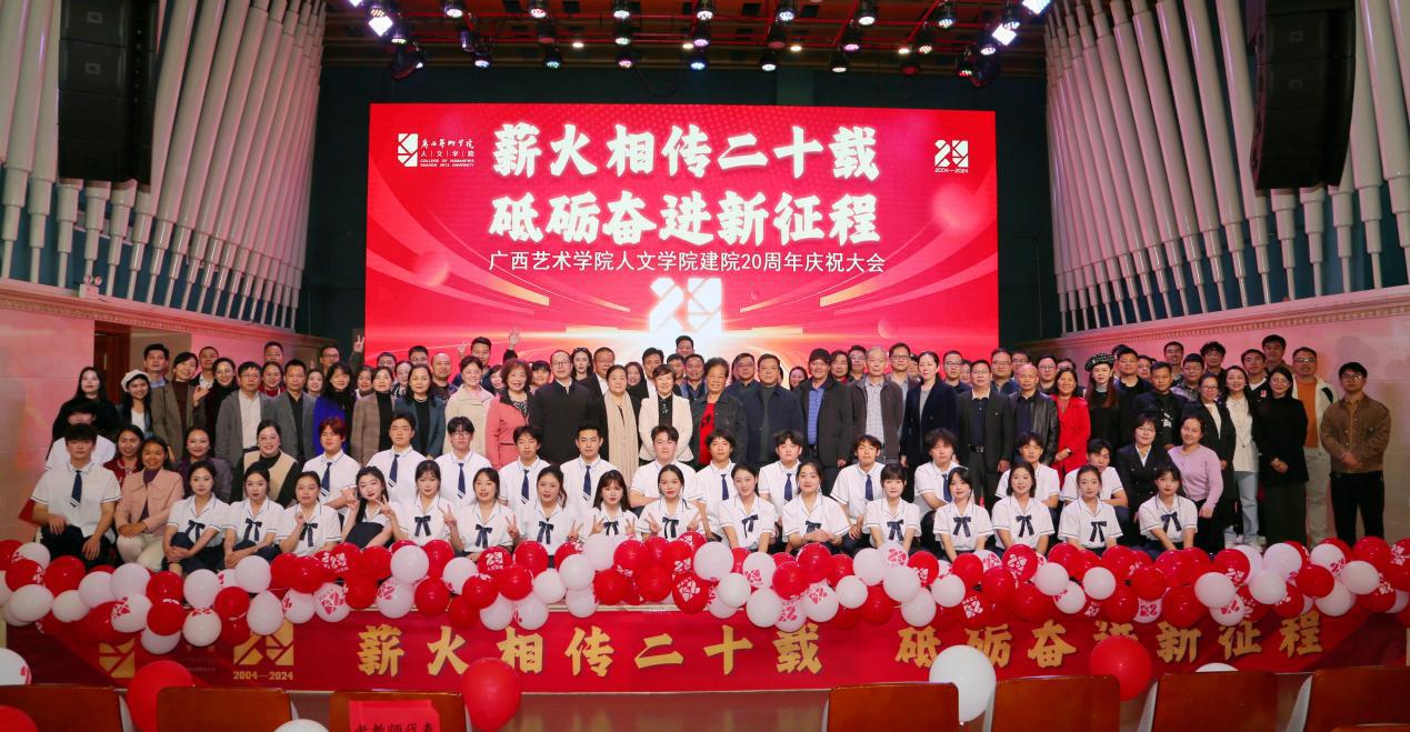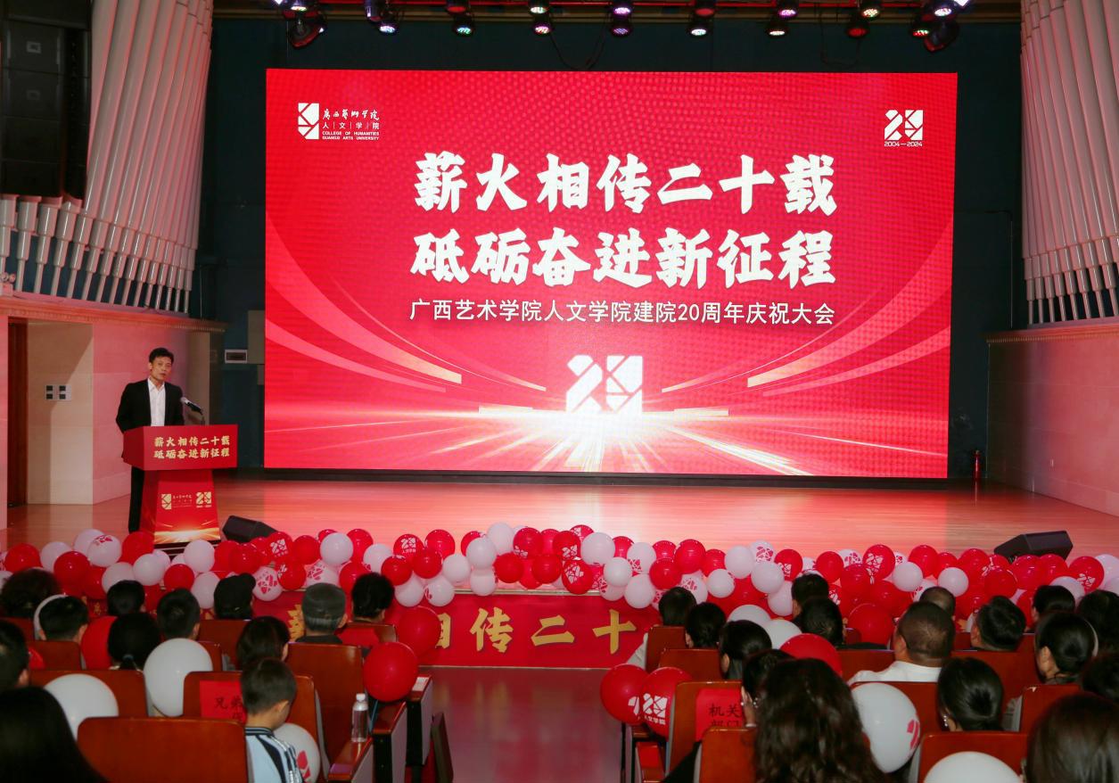 庆祝大会在雄壮的国歌声中拉开序幕。庆祝大会上,学校党委书记查丹明对人文学院二十年来在学科建设、人才培养、合作交流、服务社会等方面所取得的成绩给予高度肯定,她指出,人文学院要全面落实立德树人根本任务,着力构建以学生全面发展为核心的人才培养体系,持续发挥人文学院在创新创业教育方面的优势特色,努力办好人民满意的高等艺术教育;要坚持国家站位,立足八桂大地,聚焦国家区域发展需求,思考谋划边疆民族文化艺术与东盟艺术交流研究专业人才的培养体系,在学校“民族”“东盟”特色品牌建设中形成人文方案,为学校事业发展贡献人文力量;要持续发扬团结奋斗、奋勇争先的拼搏精神,立足“两个大局”,深刻思考学院高质量发展的时代命题,奋力开创一流人文学院建设新局面。