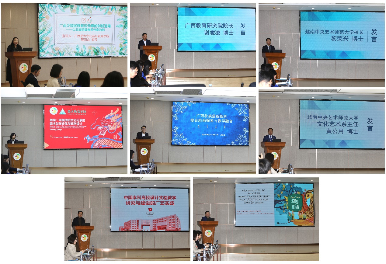 在研讨会上,来自广西艺术学院、广西教育研究院、越南中央艺术师范大学的专家学者现场作了学术报告及展示,双方围绕“赓续友谊·艺创未来”的主题,开展音乐教育、美术教育、设计教育等领域的交流探讨,共话新时代背景下中越高等艺术教育发展大计。