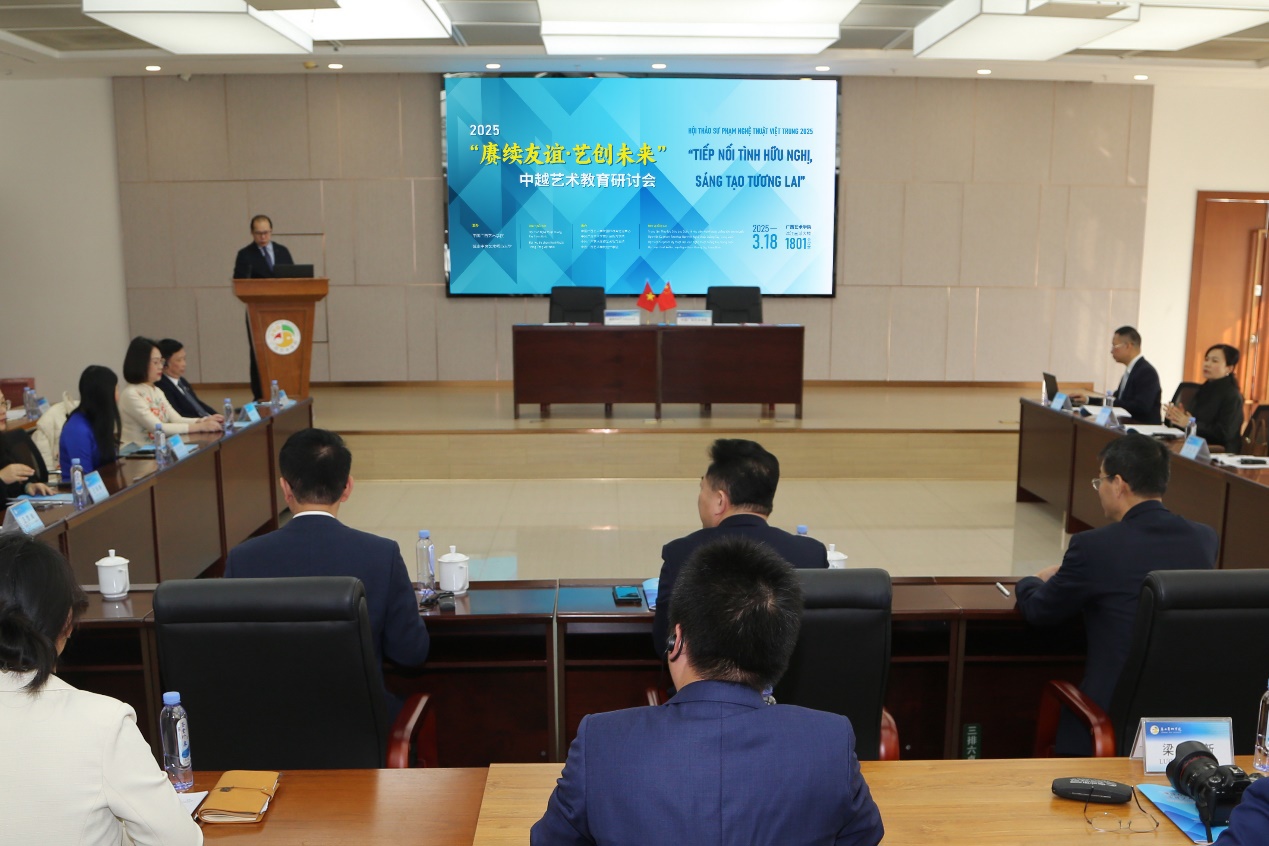 今年是庆祝中越建交75周年,也是“中越人文交流年”。3月18日上午,“赓续友谊·艺创未来”中越艺术教育研讨会在我校举行。广西文化和旅游厅、广西艺术学院、广西教育研究院、越南中央艺术师范大学等单位的领导及嘉宾出席开幕式。