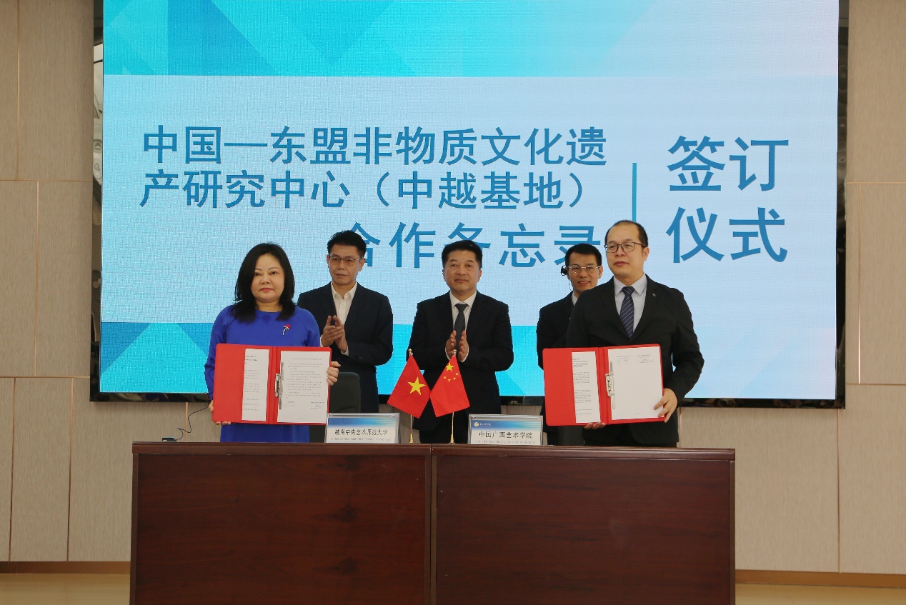 会上,我校与越南中央艺术师范大学共同签署了两校合作备忘录和中国—东盟非物质文化遗产研究中心(中越基地)合作备忘录,正式成立中国—东盟非物质文化遗产研究中心(中越基地),该中心将打造跨国人才联合培养体系,旨在推动高等艺术教育和文化遗产合作研究与专业交流的“先试先行”,大力推进面向越南的区域国别艺术研究。