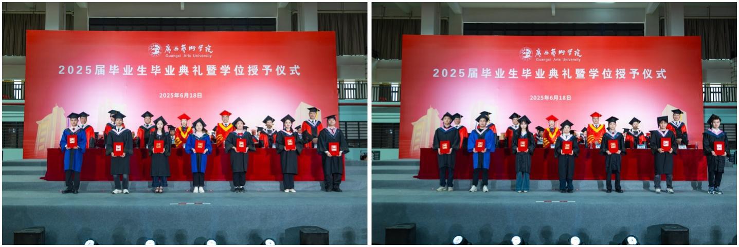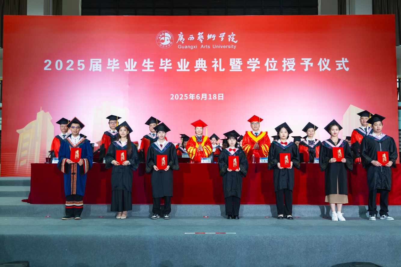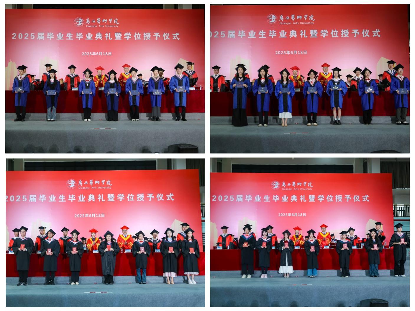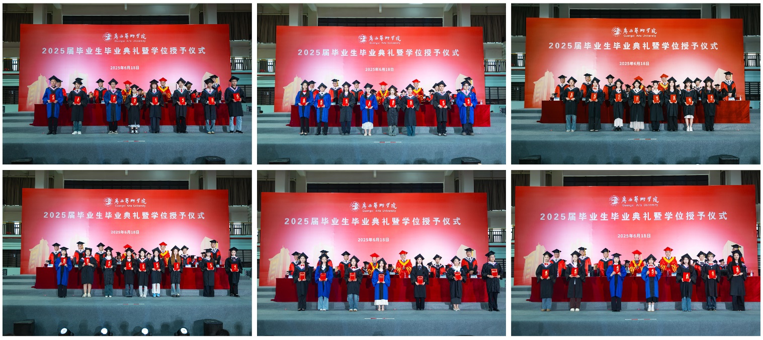 经学校研究决定,批准3102名本专科生与730名全日制研究生毕业;经广西艺术学院学位评定委员会审议通过,决定授予3098名本科毕业生学士学位,726名全日制研究生硕士学位。学校领导共同为毕业生代表们授予学士学位和硕士学位、拨正流苏并合影留念。