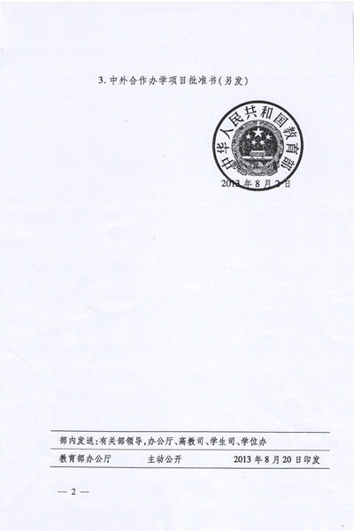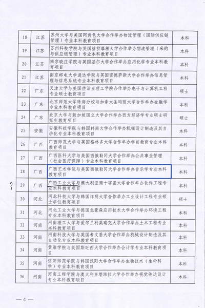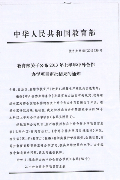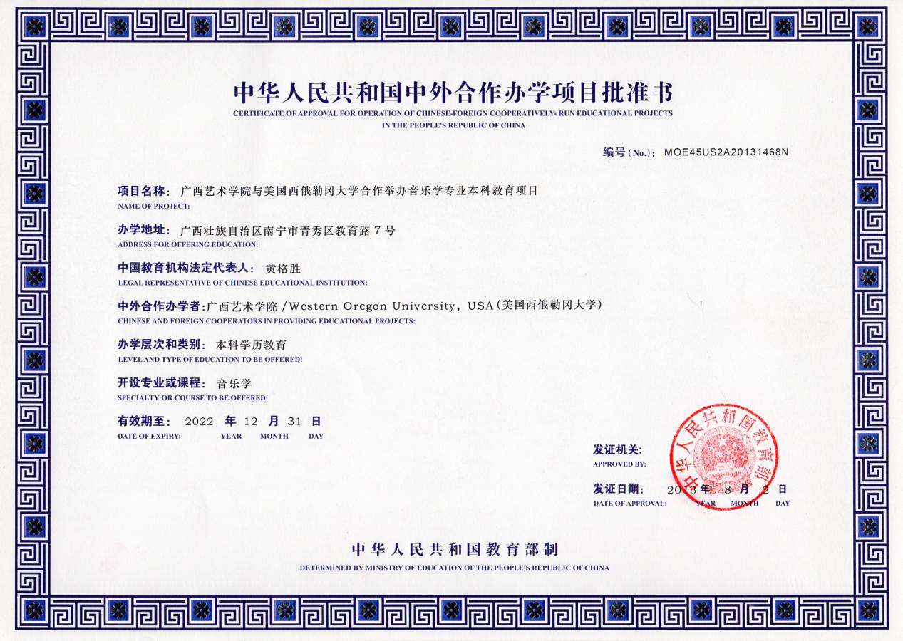 我校首个中外合作办学本科项目喜获批准 来源: 发布时间:2018-05-05 16:13 浏览次数: 次 【字体:小 大】 2013年8月,广西艺术学院与美国西俄勒冈大学合作开办的音乐学中美“3+1”本科项目获得中华人民共和国教育部批准。 中华人民共和国中外合作办学项目批准书 教育部关于公布2013上半年中外合作办学项目审批结果的通知 【打印正文】 分享到: