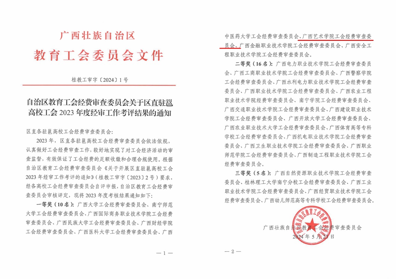 近日,自治区教育工会经费审查委员会公布2023年度区直驻邕高校工会经审工作考评结果,我校工会经费审查委员会荣获区直驻邕高校工会2023年度经审工作考评一等奖。
