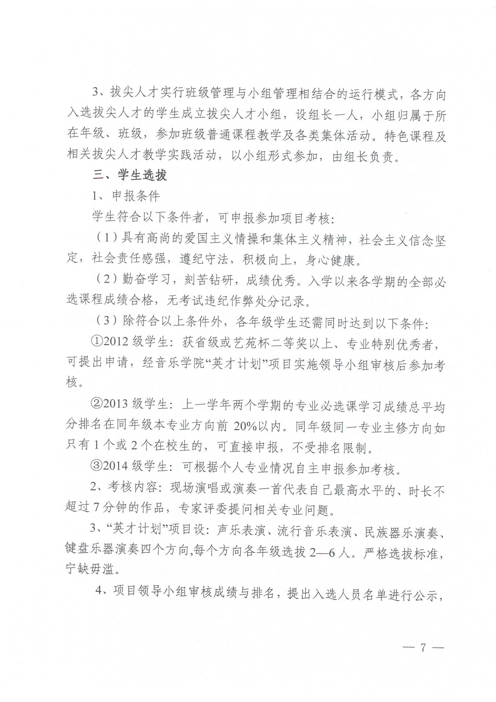 1.2012级学生:获省级或艺苑杯二等奖以上、专业特别优秀者,可提出申请,经音乐学院“英才计划”项目实施领导小组审核后参加考核。